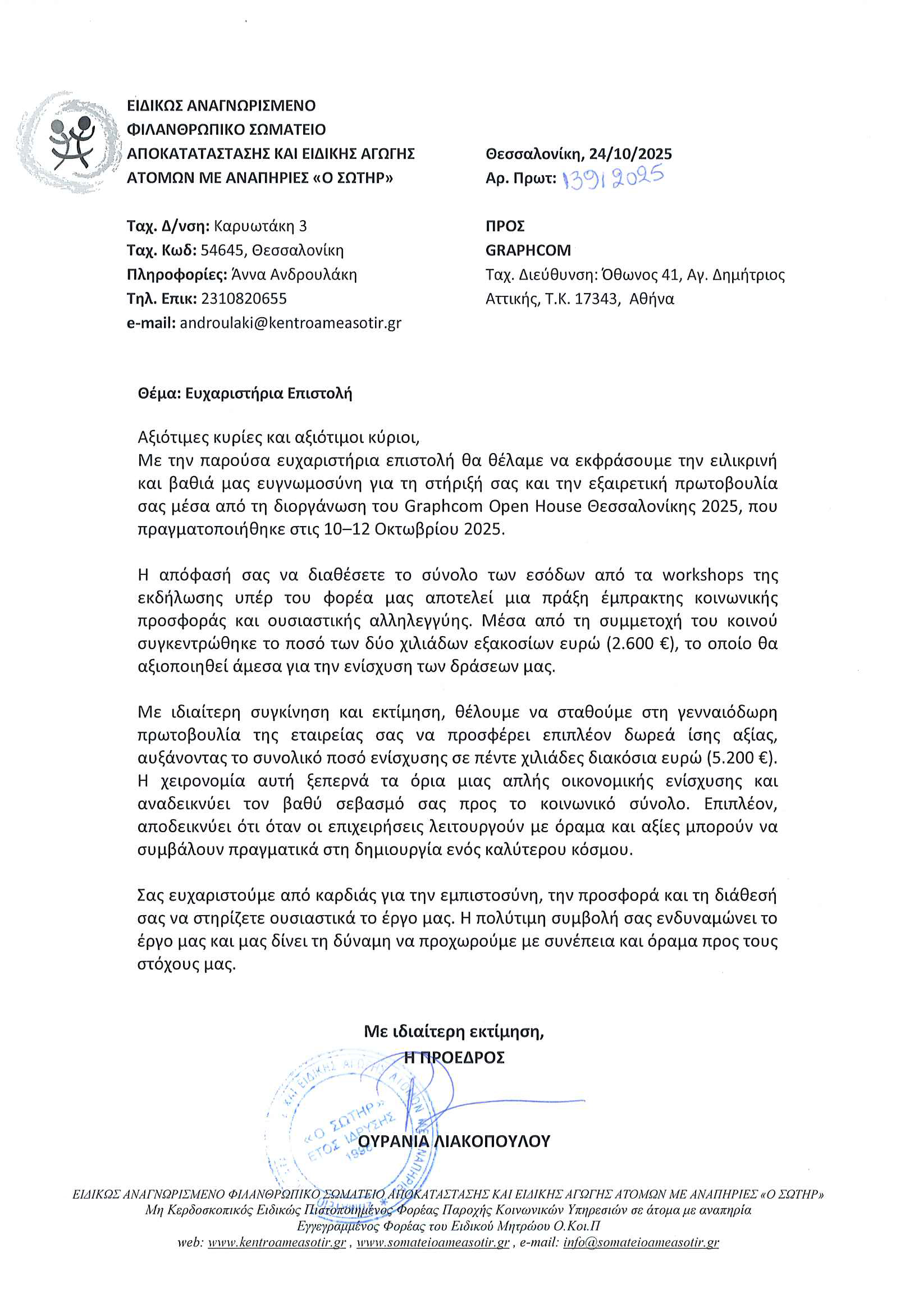 Η GRAPHCOM, πιστή στη δέσμευσή της να διαθέσει τα έσοδα συμμετοχής στην εκδήλωση “OPEN HOUSE & WORKSHOPS” σε φιλανθρωπικό φορέα, προχώρησε στην προσφορά συνολικού ποσού 5.200€ στο Κέντρο Αποκατάστασης, Κοινωνικής Στήριξης και Δημιουργικής Απασχόλησης Ατόμων με Αναπηρίες “Ο ΣΩΤΗΡ”.