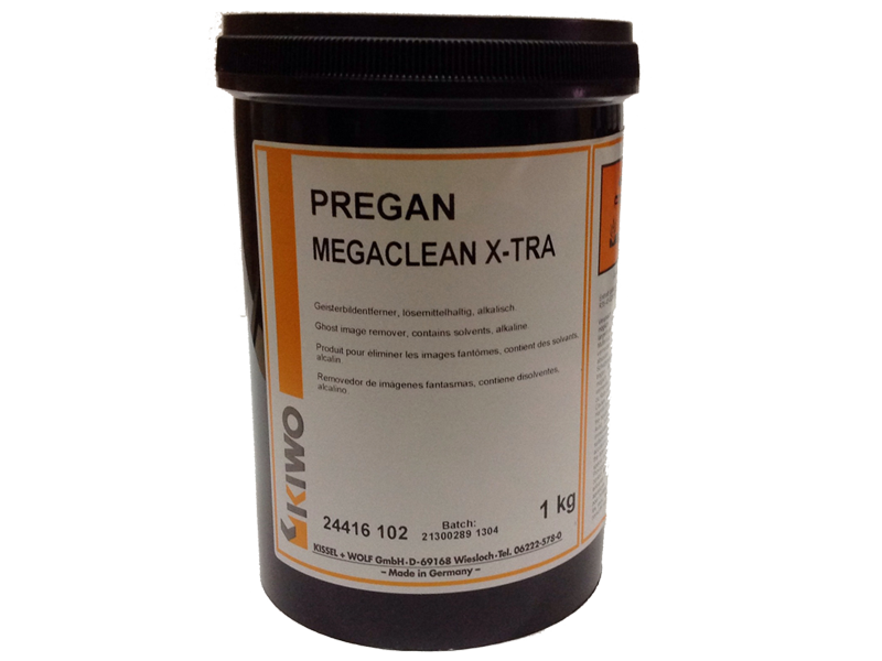 Το PREGAN MEGACLEAN X-TRA είναι ένα ιδιαίτερα παχύρρευστο, αλκαλικό διάλυμα για τον καθαρισμό φαντασμάτων, υπολειμμάτων μελανιού και υπολειμμάτων εμουλσιόν μετά το decoating. Σε συνδυασμό με καθαριστικά για την αφαίρεση φαντασμάτων (π.χ. PREGAN ANTIGHOST) μπορεί να χρησιμοποιηθεί και ως ενεργοποιητής για την αφαίρεση πολλών μελανιών εκτύπωσης. Το PREGAN MEGACLEAN X-TRA έχει υψηλό σημείο ανάφλεξης και είναι σχεδόν άοσμο. Το υωηλό του ιξώδες επιτρέπει την εφαρμογή με σπάτουλα επαλείψεως. Στα συνήθη ποσοστά αραίωσης, τα μίγματα καθαριστικού/νερού μπορούν να απορριφθούν σε κατάλληλα βιολογικά συστήματα επεξεργασίας λυμάτων.